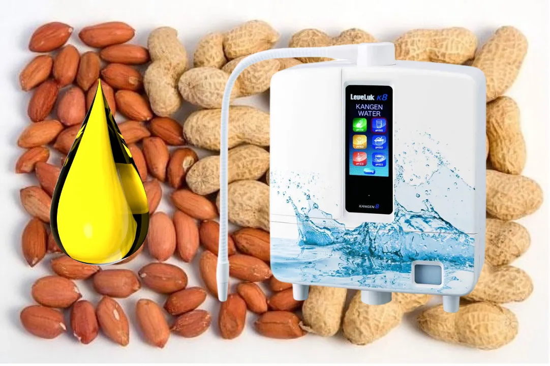 Lạc được ngâm với nước Kangen axit mạnh pH 2.5 để diệt khuẩn, nấm mốc và ngâm với nước kiềm mạnh Kangen pH 11.5 để bóc tách chất bảo quản